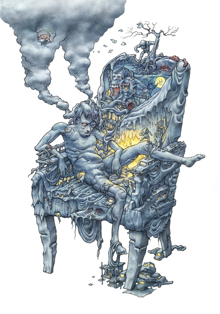 Illustrazione per il futuro numero di INTERIORS a tema “Fatti non foste a viver come bruti ma per seguir virtute e canoscenza”. Dal tema del conoscere (sè stessi) e dell’abbrutimento ne sono uscito con un’onesto autoritratto esistenziale (con tanto di scimmia sulla schiena).Link alla pagina facebook del COLLETTIVO INTERIORS https://www.facebook.com/interiorscollettivo/